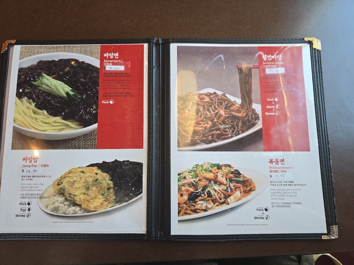 Noodle with black soy bean sauce are stir-fried with variety of vegetables , pork and seafood (shrimp and squid) medium spicy(5-6 spicy level). Portion for 2 people